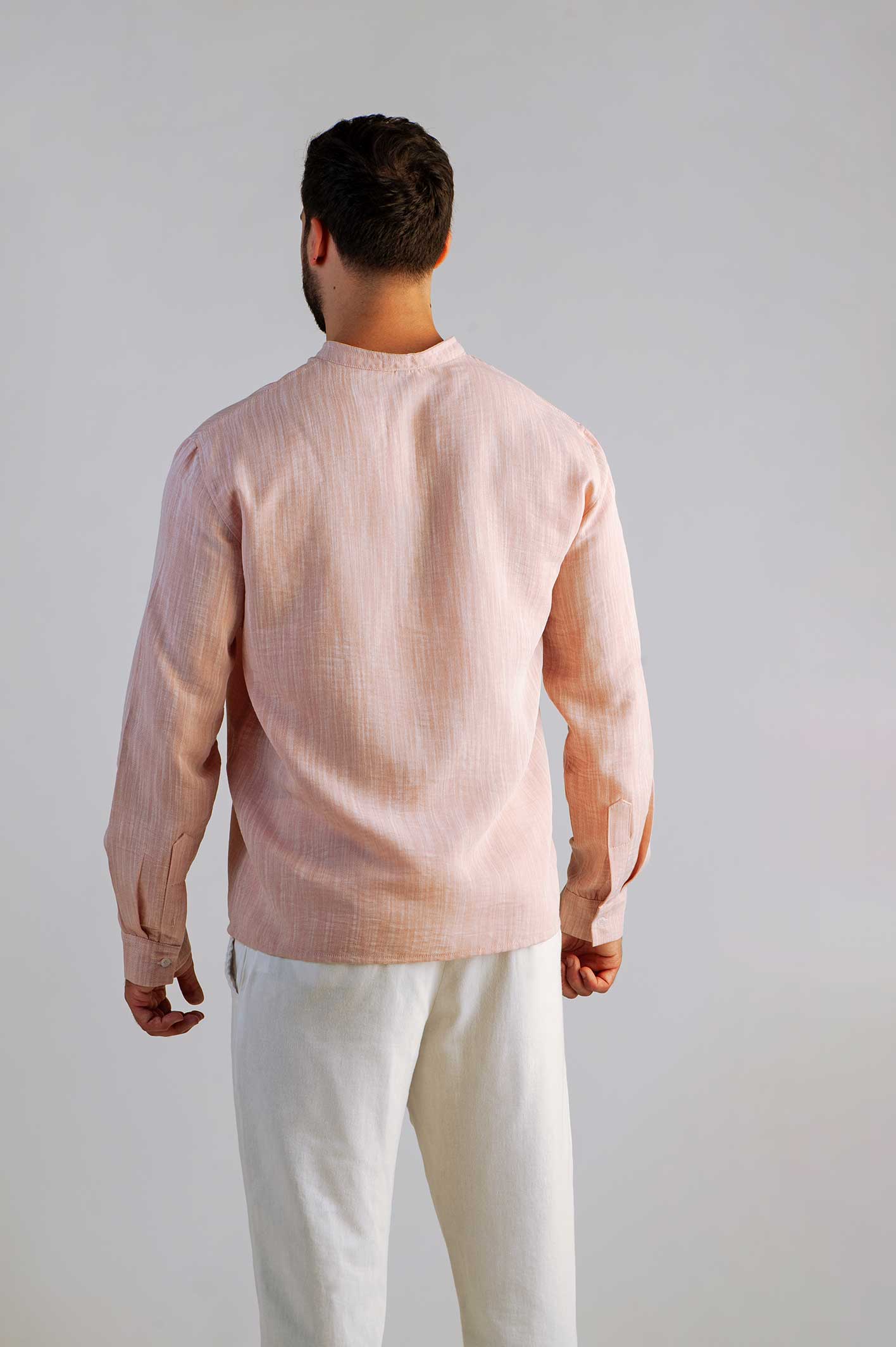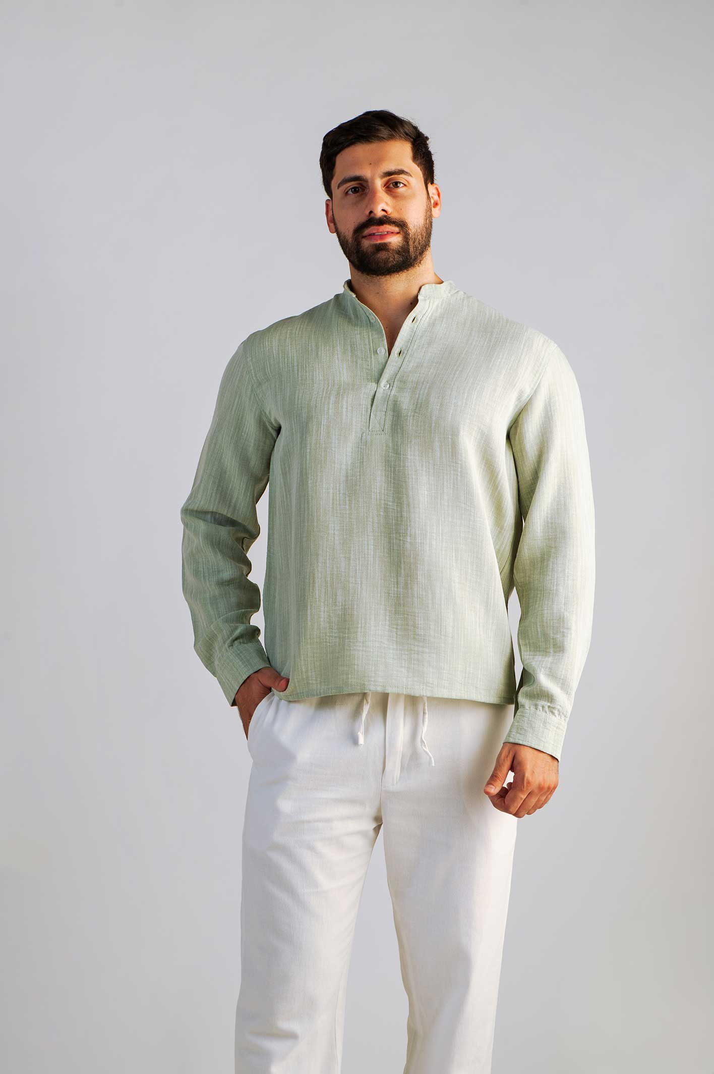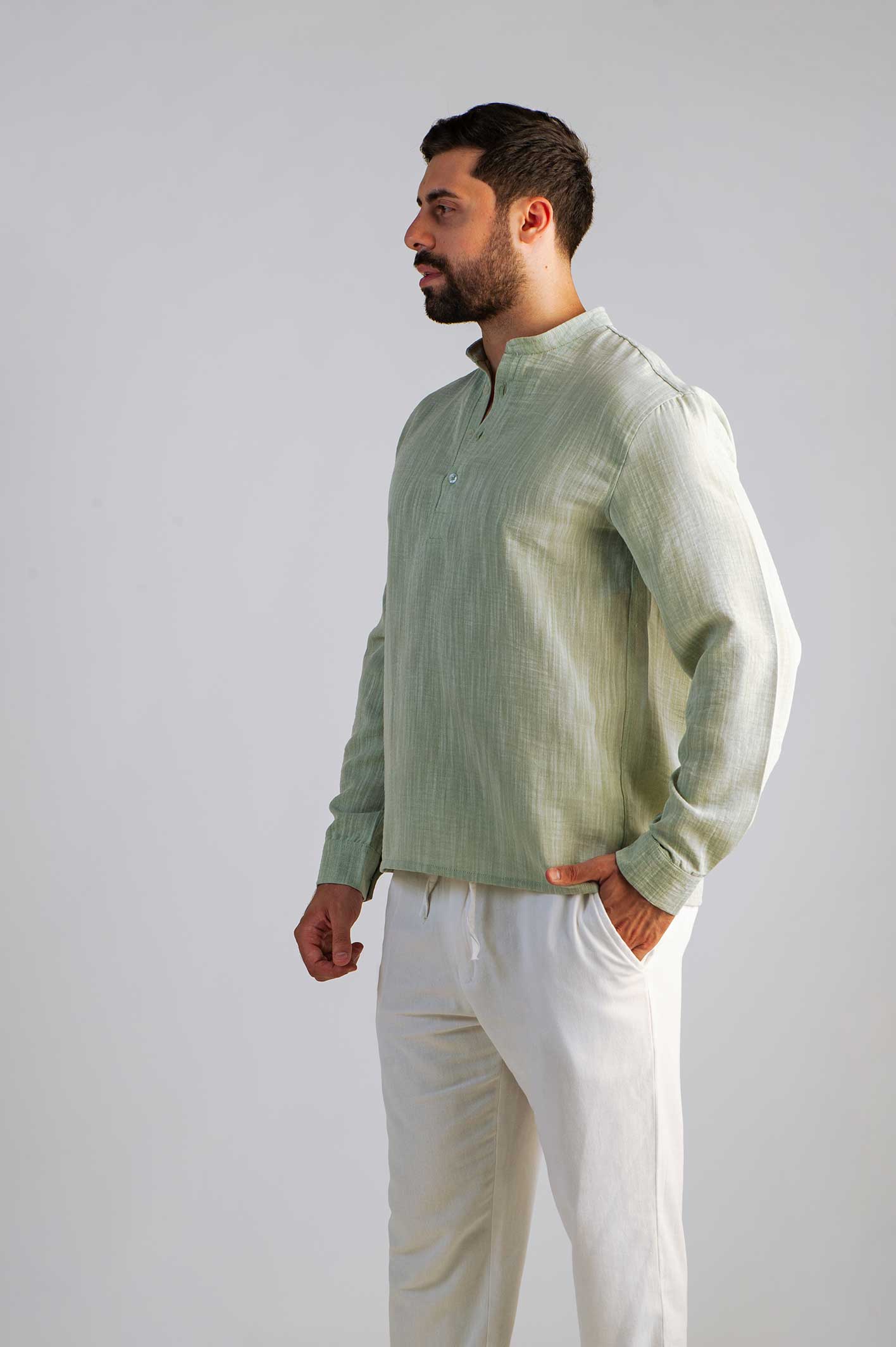 قميص لينن قبة صيني نصف زرار. تصميم عملي وأنيق يمنح ملمساً ناعماً وراحة طوال اليوم، مثالي للإطلالات اليومية والكاجوال