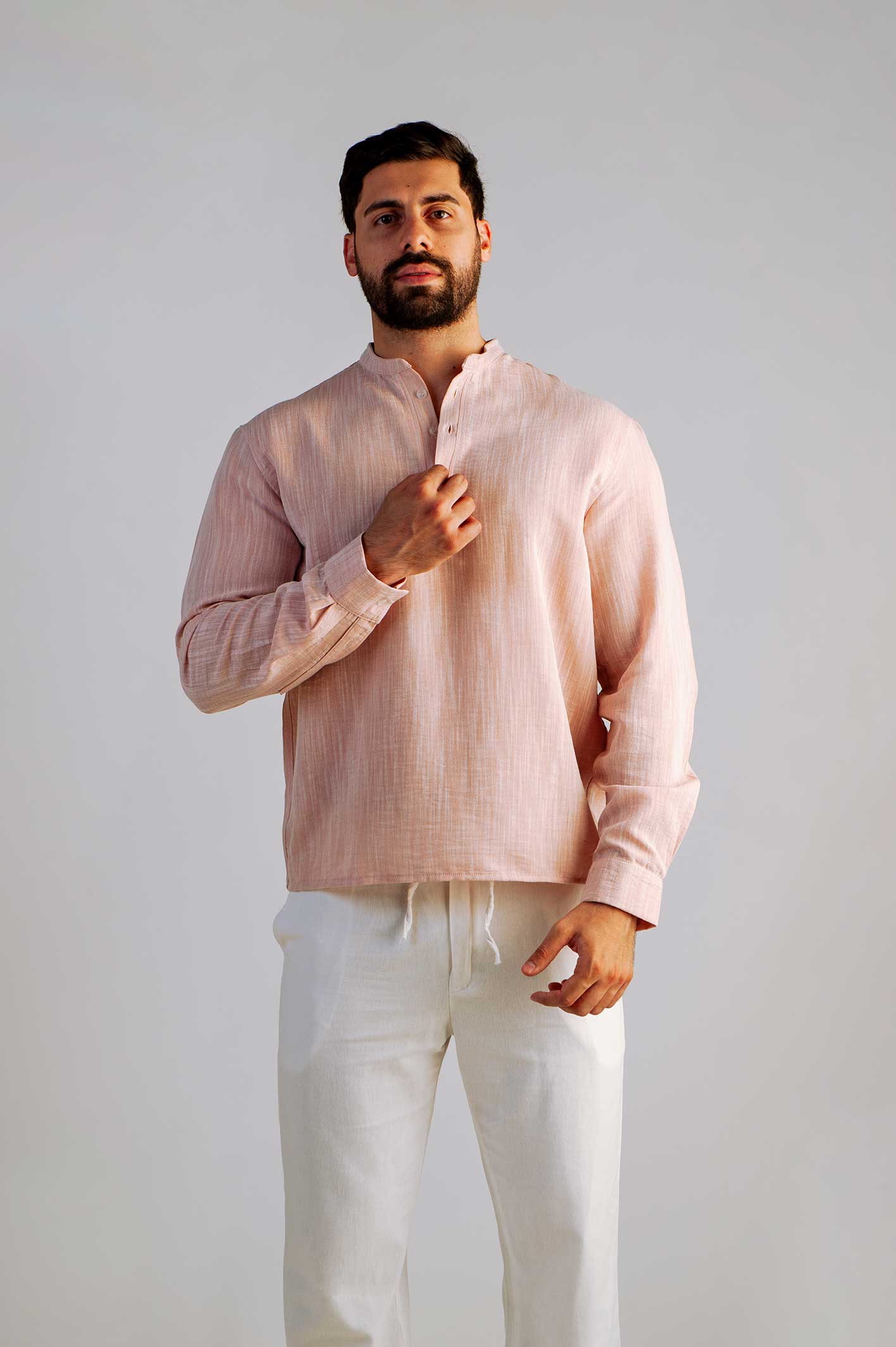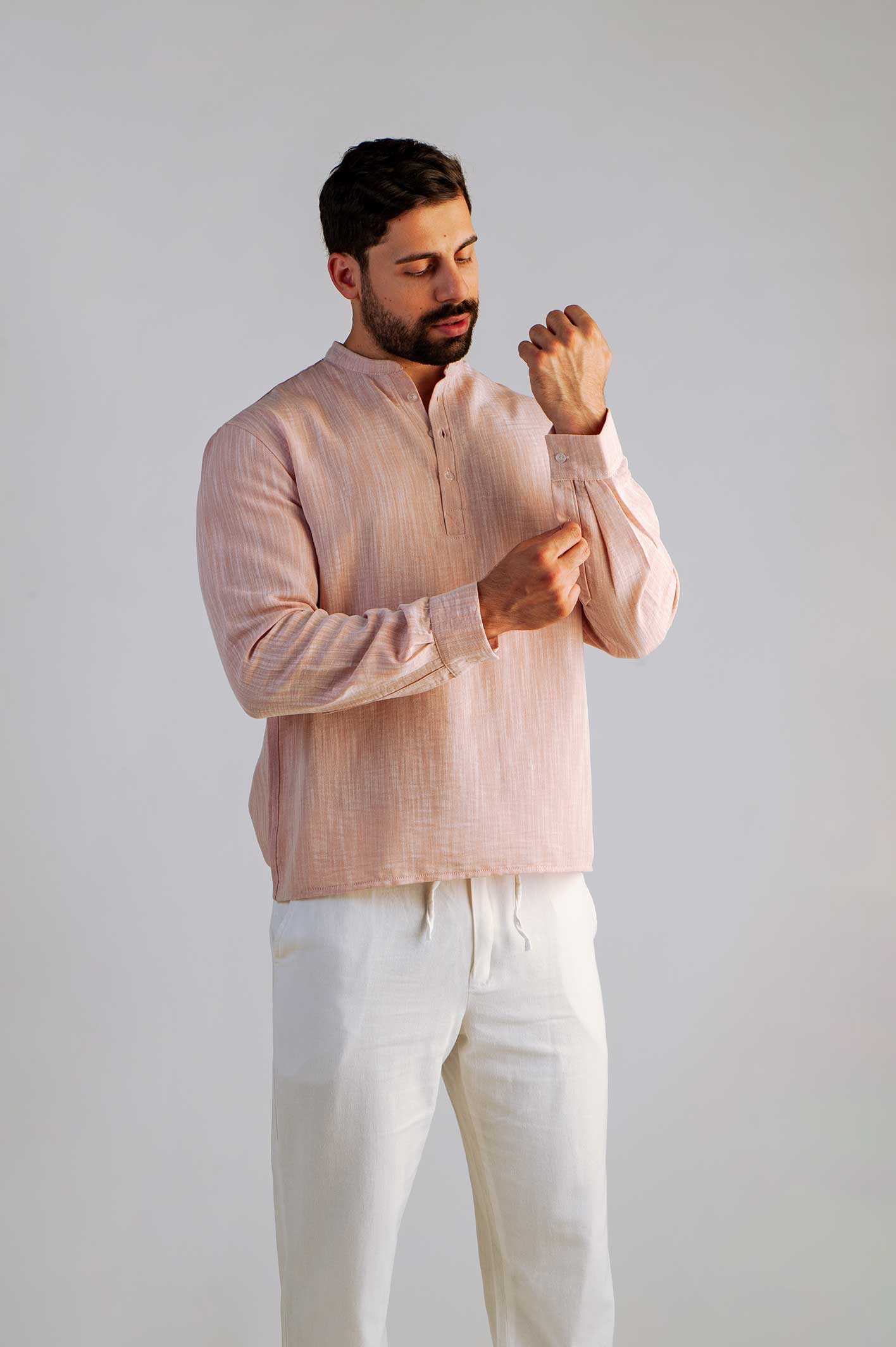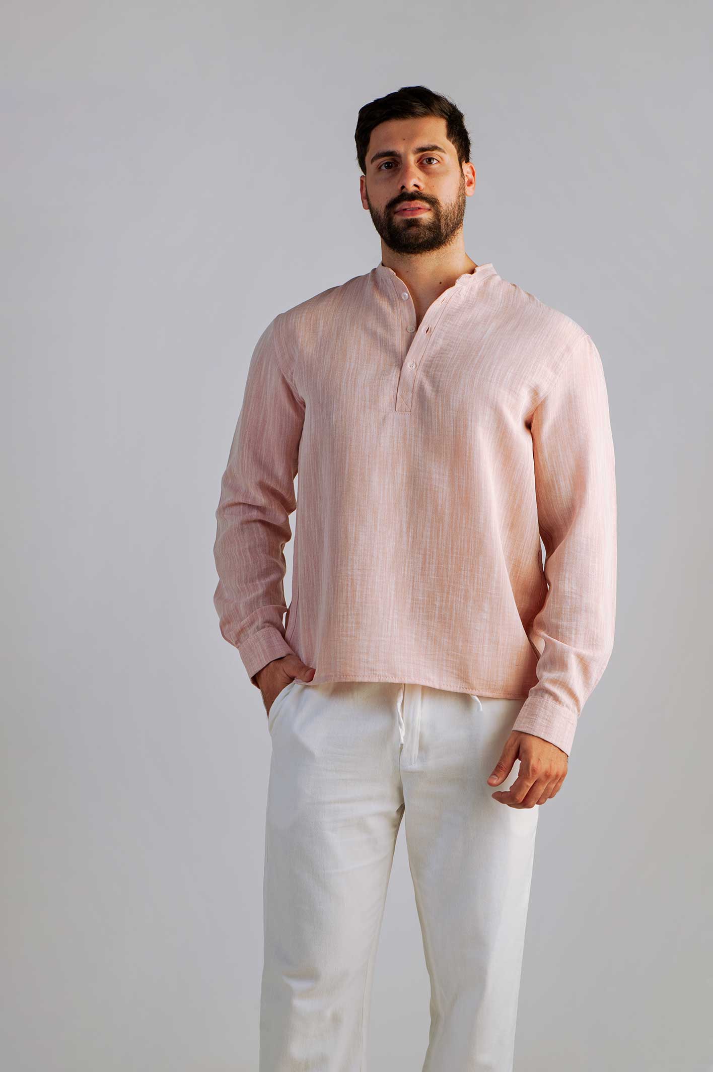 قميص لينن قبة صيني نصف زرار. تصميم عملي وأنيق يمنح ملمساً ناعماً وراحة طوال اليوم، مثالي للإطلالات اليومية والكاجوال